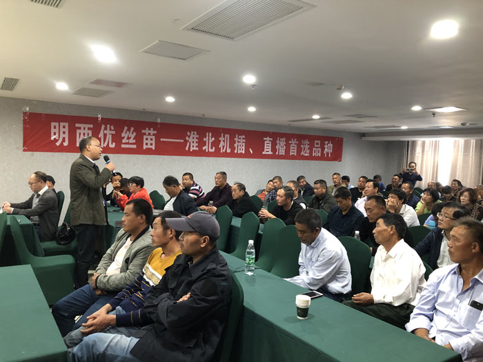接著由睢寧縣經銷商代表彭奔就明兩優絲苗在睢寧示范種植、品種田間表現、肥料運籌情況作了詳細分享。彭總認為明兩優絲苗:第一、熟期早特別適合江蘇淮河以北機插、沿淮直播,第二、株高矮、株型緊湊、抗倒性強,第三抗病性強,示范種植三年田間無病害。是一個非常具有推廣價值和前景的大品種,同時也是一個淮河以北稀缺的雜交水稻機插合法品種。