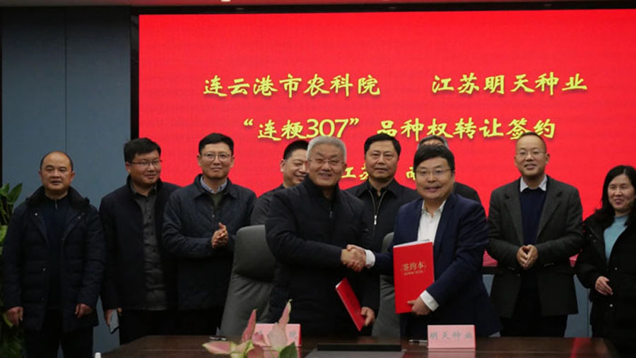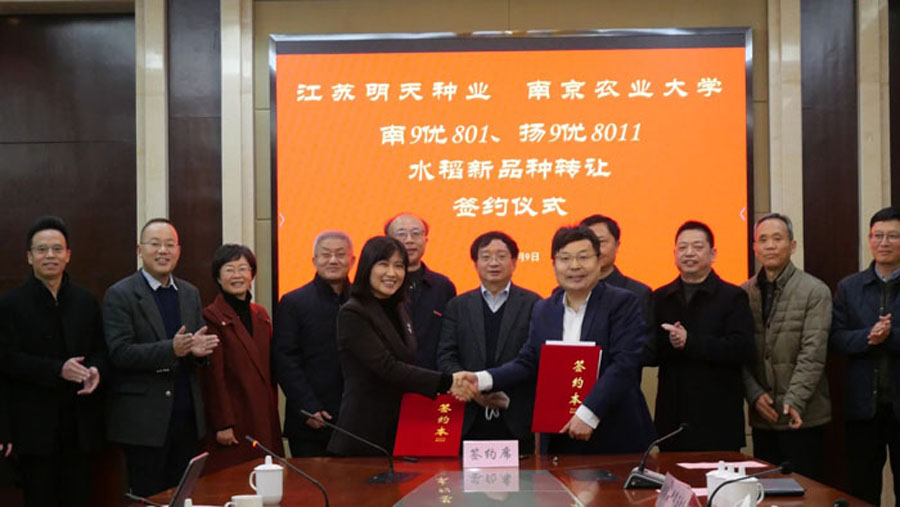 2023年1月9日,江蘇明天種業(yè)科技股份有限公司分別與南京農(nóng)業(yè)大學(xué)、連云港市農(nóng)業(yè)科學(xué)院在南京農(nóng)業(yè)大學(xué)金陵研究院和公司會議室,就萬建民院士團(tuán)隊秈稻品種最新成果“南9優(yōu)801”、“揚9優(yōu)8011”及江蘇明天種業(yè)與連云港市農(nóng)科院聯(lián)合選育的粳稻新成果“連粳307”隆重舉行轉(zhuǎn)讓簽約儀式。江蘇明天種業(yè)成功簽約三品種全國獨占實施許可經(jīng)營權(quán)。江蘇省農(nóng)業(yè)農(nóng)村廳、南京農(nóng)業(yè)大學(xué)、連云港市農(nóng)科院等領(lǐng)導(dǎo)、專家到會見證。